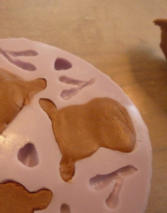 Druk een klein bolletje bruine marsepein in de mold.